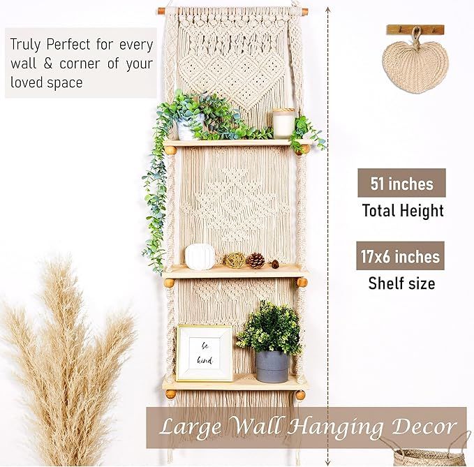 Macrame Wall Hanging Shelf 3 Tier Boho Wall Plant Hanger Shelves, Handmade of Woven Rope Boho Shelves Organizer for Living Room Bathroom Home Storage Floating Plant Rack Bohemian décor