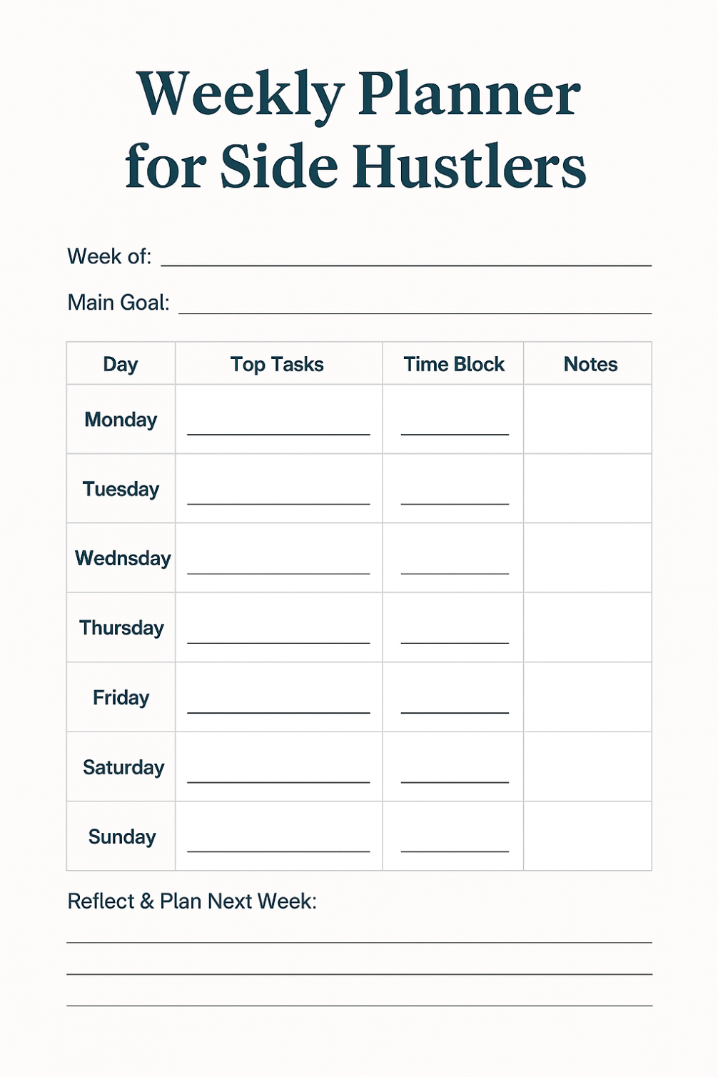 Here are some essential templates and trackers to help you stay organized and focused with your side hustle — from money management to content marketing and daily planning: